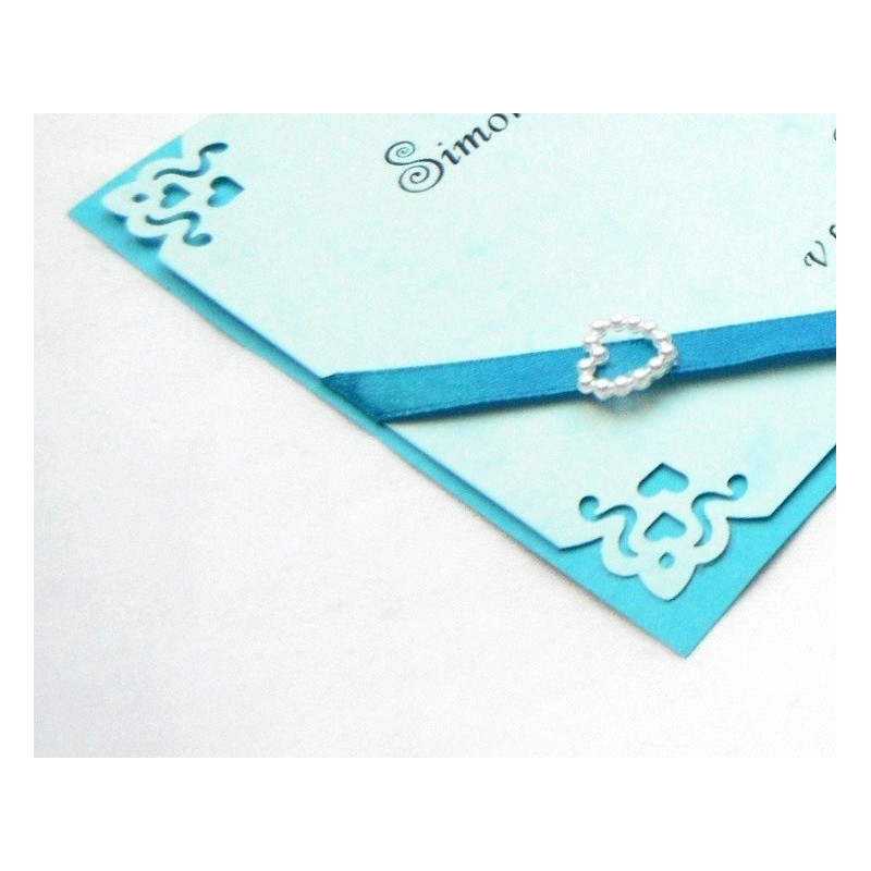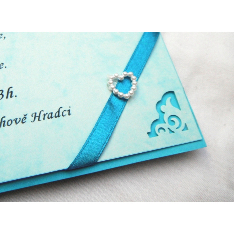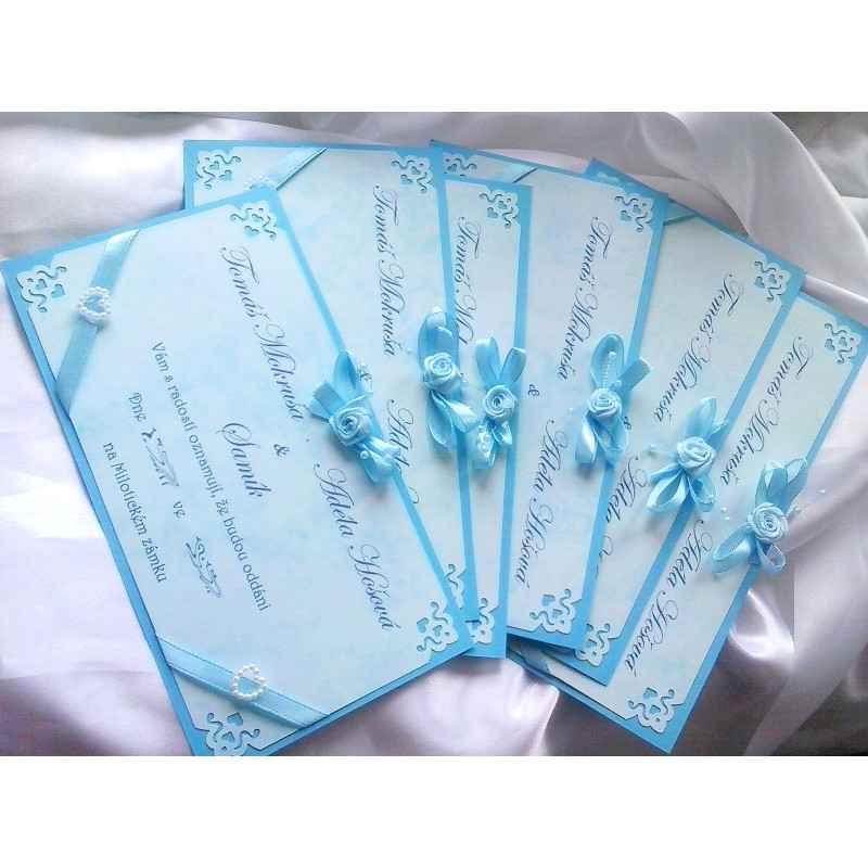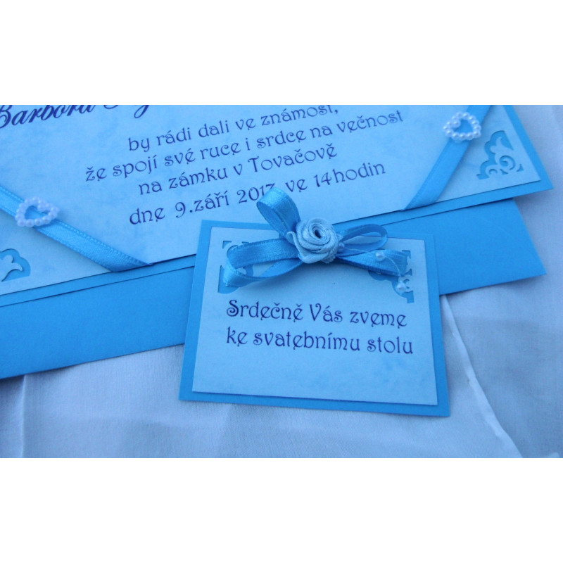 Svatební oznámení z pevného barevného papíru (bílý i modrý papír 160g) zdobený vyřezávanými ornamenty, atlasovou mašličkou a růžičkou a perličkovými srdíčky. Rozměry 18,5x10cm (