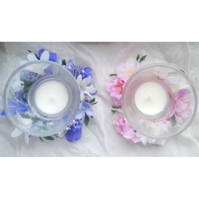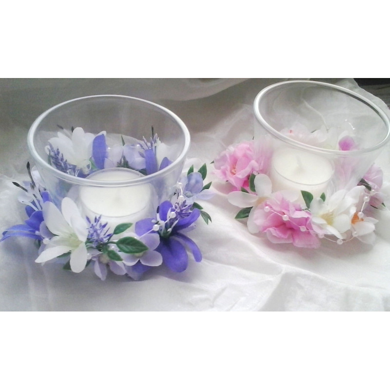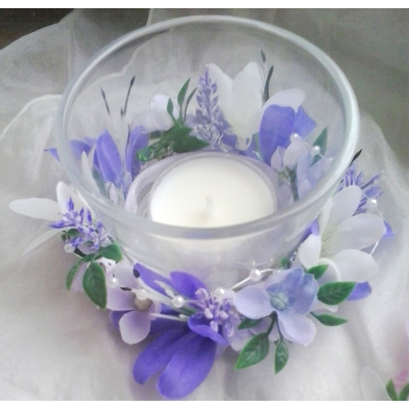 Skleněný svícínek zdobený látkovými kvítky. Dodáváme včetně vonné čajové svíčky.
