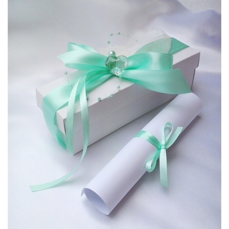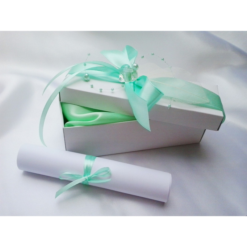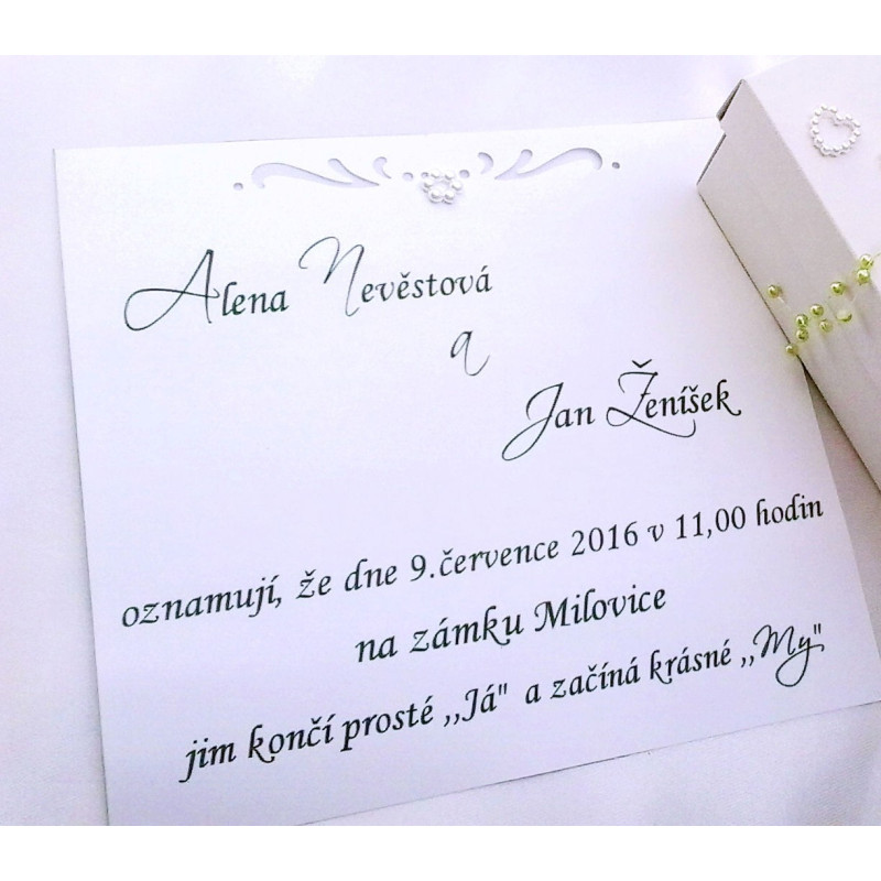 Vnitřek krabičky je vyložený saténem, oznámení s jednoduchým vyřezaným ornamentem, zdobené perličkovým srdíčkem nebo květinkou. Oznámení je stočené do ruličky a převázané atlasovou stuhou. Vrch krabičky je zdobený atlasovou stuhou,průhledným srdíčkem a perličkami.